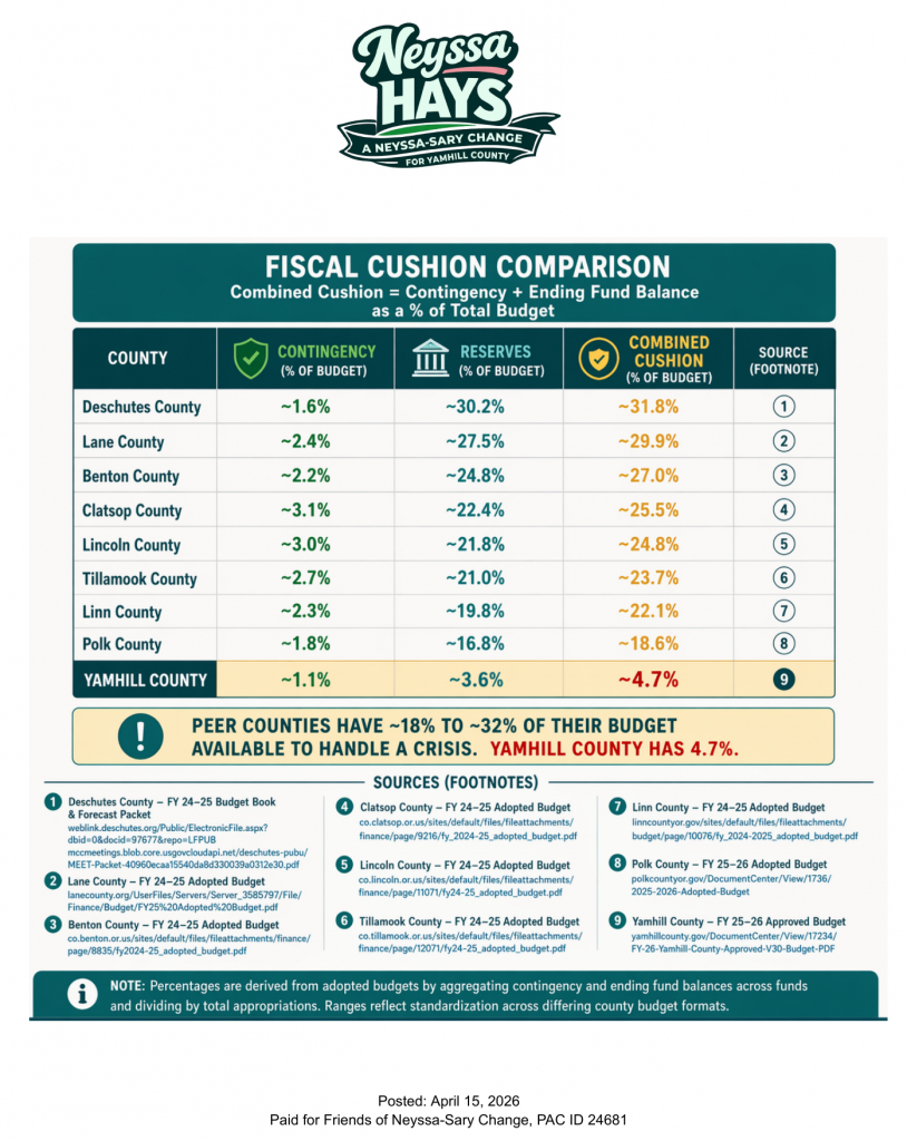 Yamhill County is showing the warning signs of a failing organization: selling public assets, deferred maintenance, and cuts to essential services. We need to return to practical governance that works the way households and small businesses have to work, with clear priorities, honest budgeting, and long-term planning. When leaders can’t collaborate, services suffer and taxpayers pay the bill.
